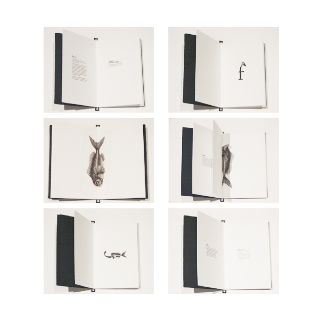 La colección se forma como un cardumen: al menos seis libros que se agrupan por especie y afinidad. Cada ejemplar vincula un pez con una letra de su familia tipográfica. Ambos son diseccionados y comparados mediante ilustraciones. El libro puede leerse en ambos sentidos y converge al centro en un grabado pop-up que une letra y pez.